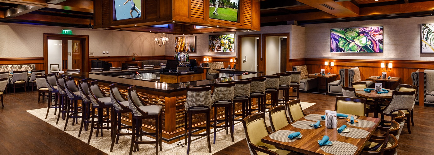 The Grill Room is open every day for lunch and dinner, and offers a more casual dining experience. The restaurant offers lighter fare, ranging from soups, appetizers and salads to burgers and sandwiches. Pizza is also on the menu prepared in our new double stack conveyor belt pizza oven. The Grill Room sports a huge, well-stocked bar, eighteen ceiling fans, and thirteen televisions for your viewing pleasure. Join us indoors or in the open air on our enclosed, roofed patio graced by a gas fireplace.